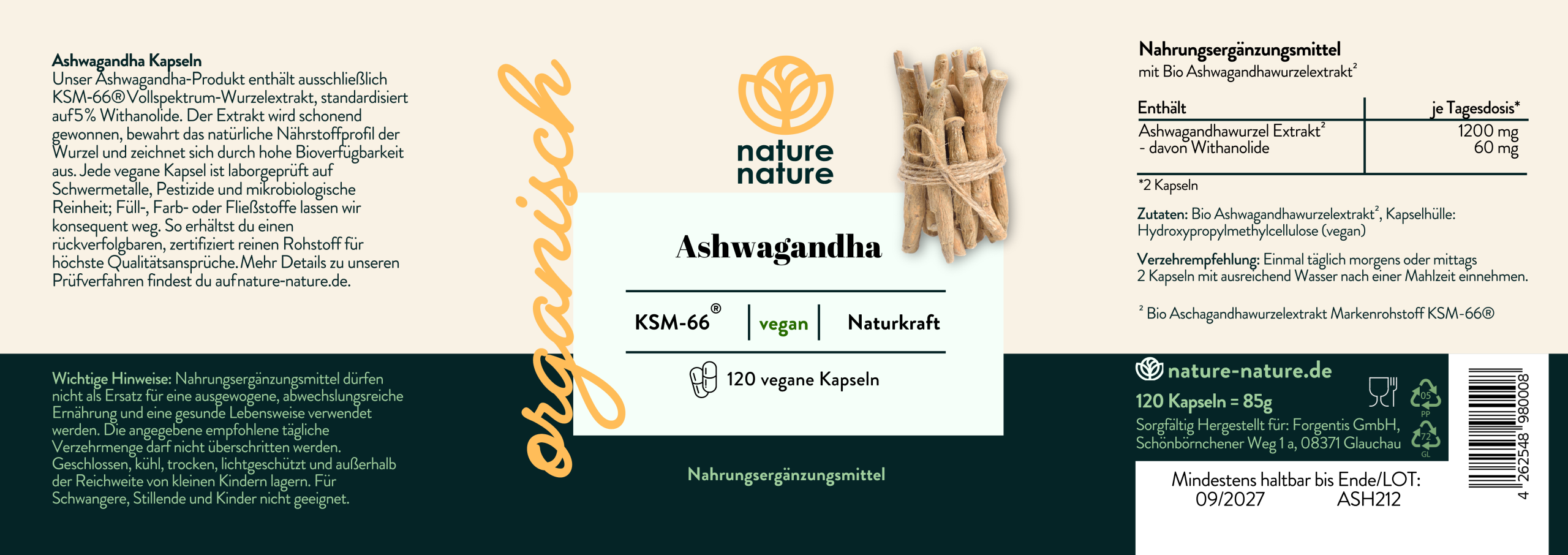 KSM-66 Ashwagandha-Extrakt (1200 mg, 5 % Withanolide) in 120 veganen Kapseln – rückstandsfrei und frei von Zusätzen.