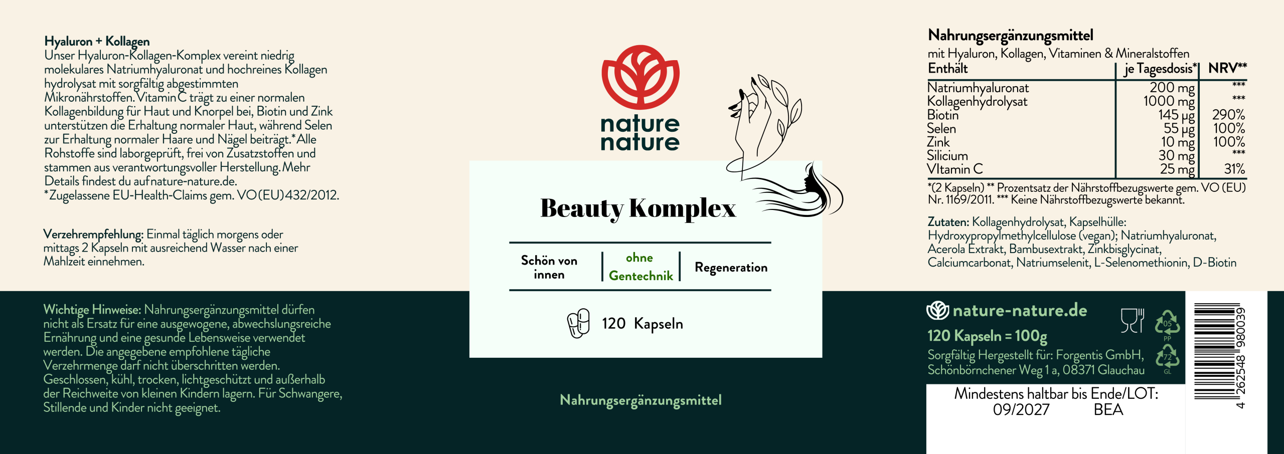 Beauty-Komplex aus 1 000 mg Kollagenhydrolysat, 200 mg Natriumhyaluronat sowie Biotin, Zink, Selen & Vitamin C in 120 veganen Kapseln – frei von Zusatzstoffen.