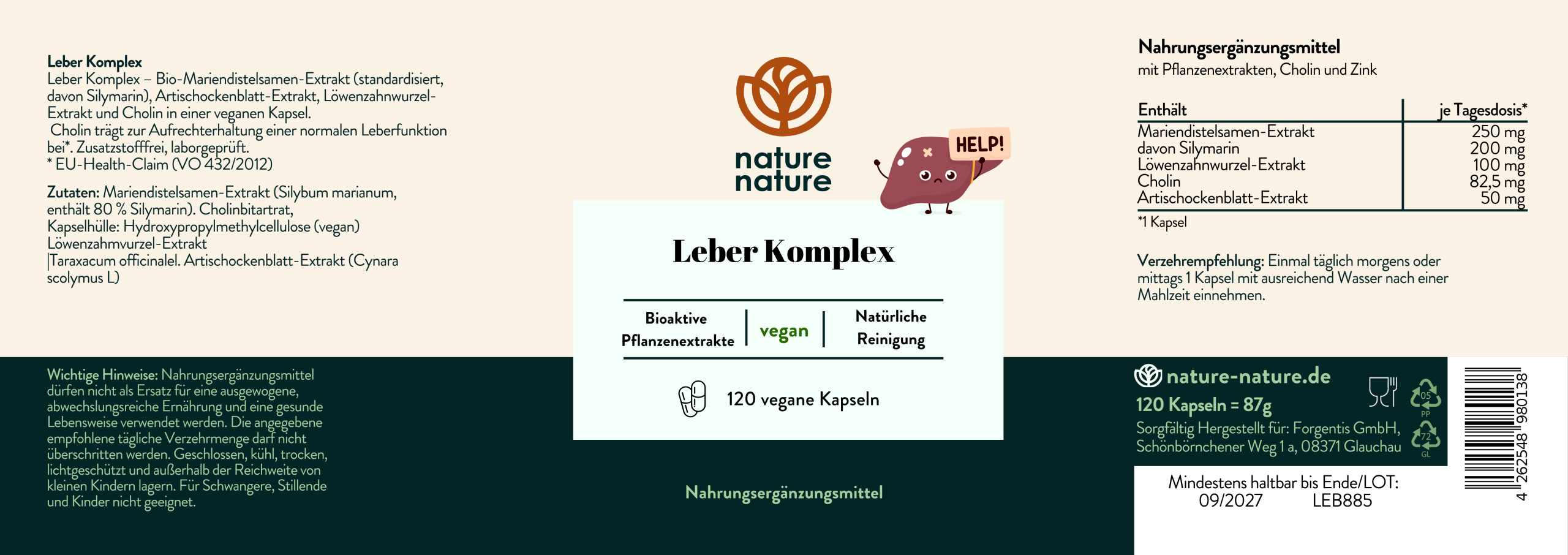Unser Leber-Komplex liefert je Tagesdosis von 1 veganen Kapsel 250 mg hochstandardisiertes Mariendistelsamen-Extrakt (80 % Silymarin = 200 mg), 100 mg Löwenzahnwurzel-Extrakt, 50 mg Artischockenblatt-Extrakt und 82,5 mg Cholin in einer reinen HPMC-Kapsel – vollständig rückverfolgbar, schwermetall- und mikrobiologisch kontrolliert sowie frei von Füll-, Farb- und Fließstoffen.