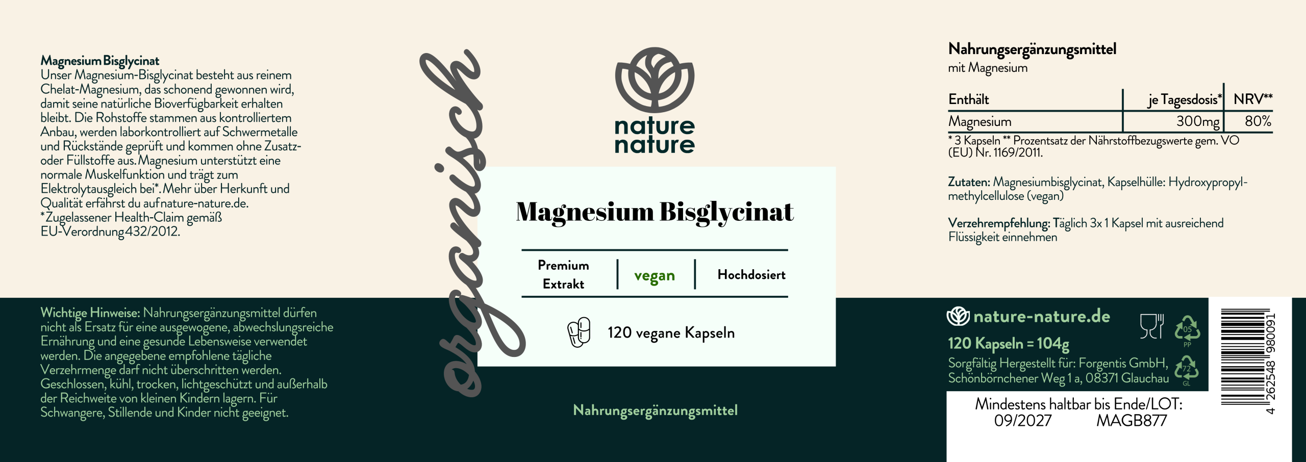 Unser Magnesium-Bisglycinat (Chelat) aus kontrolliertem Anbau liefert in 120 veganen HPMC-Kapseln pro Tagesdosis von 3 Kapseln 300 mg elementares Magnesium (80 % NRV) – frei von Zusatz-, Füll- und Farbstoffen, schwermetall- und rückstandgeprüft und schonend in Deutschland produziert für höchste Reinheit und optimale Bioverfügbarkeit.