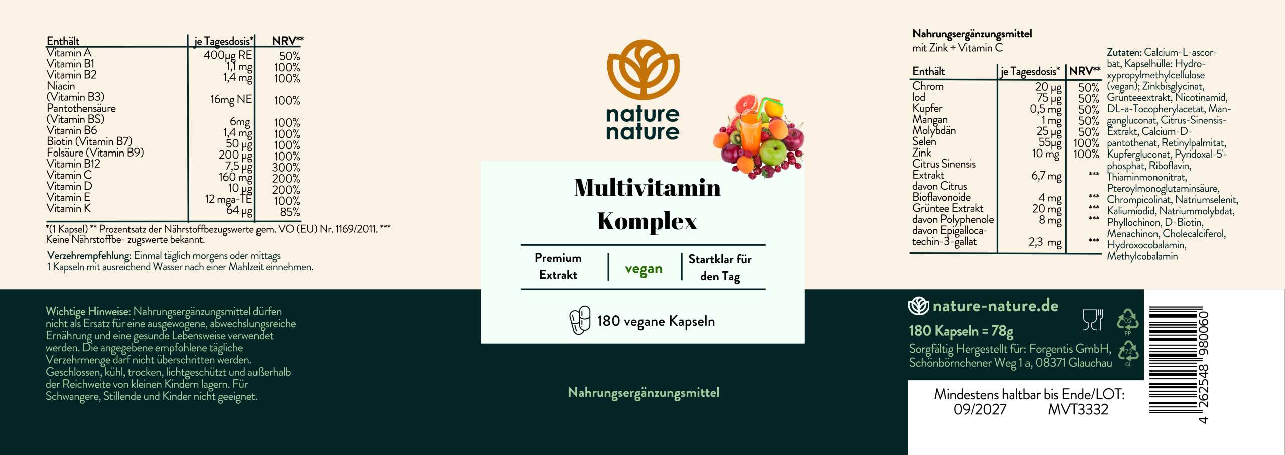 Calcium-L-ascorbat, Kapselhülle: Hydroxypropylmethylcellulose (vegan); Zinkbisglycinat, Grünteeextrakt, Nicotinamid, DL-a-Tocopherylacetat, Mangangluconat, Citrus- Sinensis-Extrakt, Calcium-D-pantothenat, Retinylpalmitat, Kupfergluconat, Pyridoxal-5′- phosphat, Ribofavin, Thiaminmononitrat, Pteroylmonoglutaminsäure, Chrompicolinat, Natriumselenit, Kaliumiodid, Natriummolybdat, Phyllochinon, D-Biotin, Menachinon, Cholecalciferol, Hydroxocobalamin, Methylcobalamin