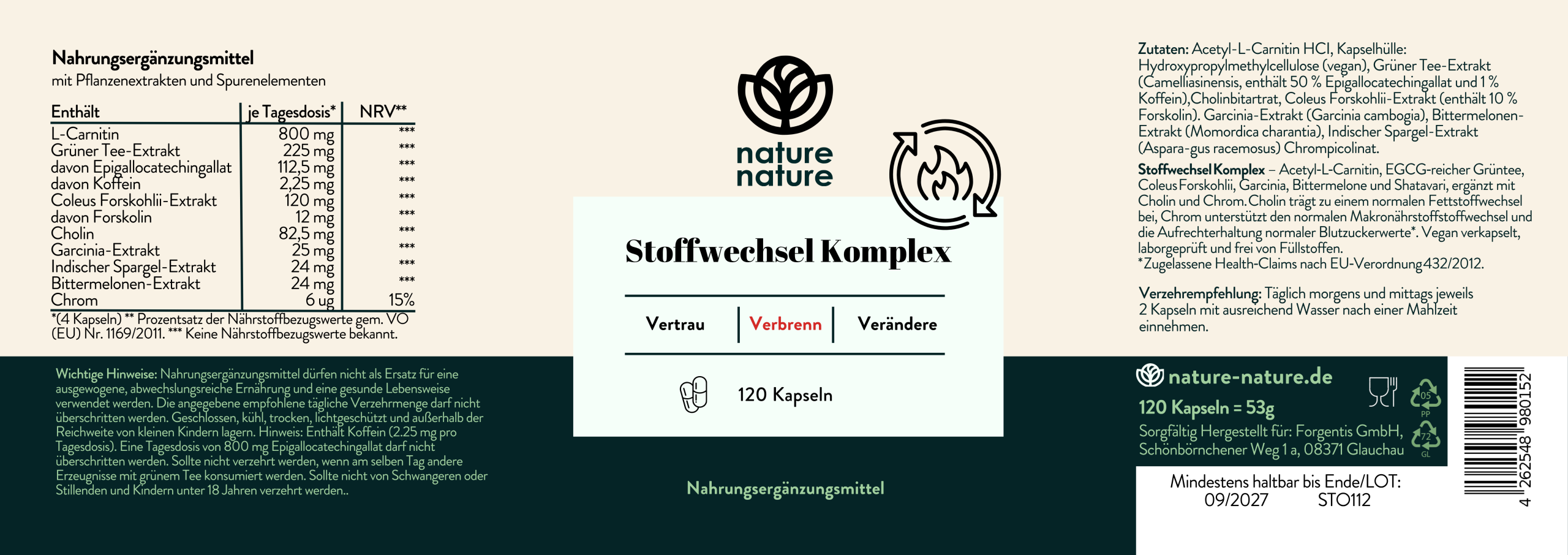 Stoffwechselkomplex aus 800 mg L-Carnitin, EGCG-reichem Grüntee, Coleus Forskohlii, Garcinia, Bittermelone & Shatavari plus Cholin + Chrom in 120 veganen Kapseln.