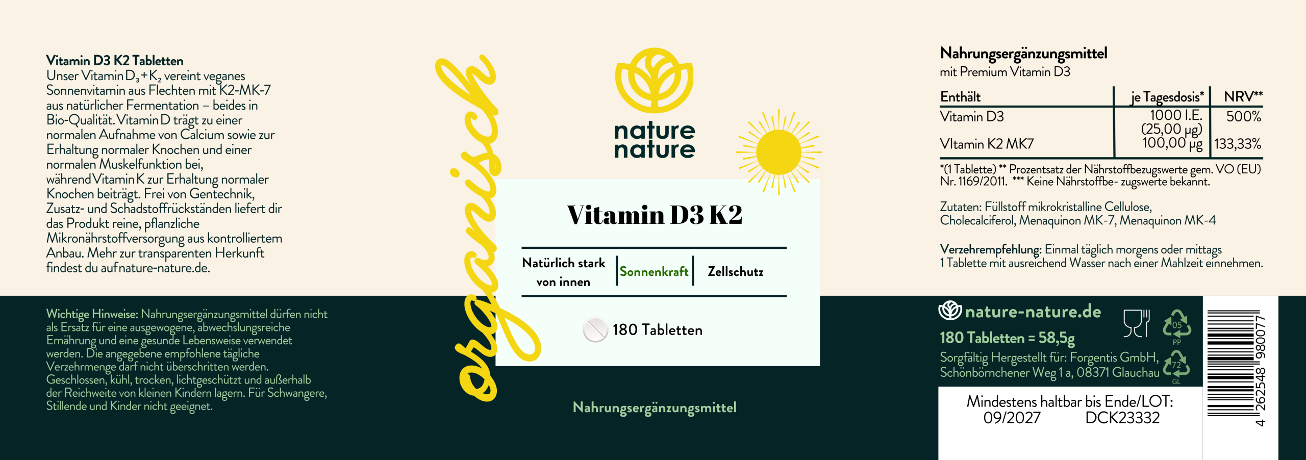 Veganes D3-K2 Duo mit 1 000 I.E. Vitamin D₃ (25 µg) & 100 µg K2 aus natürlicher Fermentation in 180 Tabletten – frei von Zusatzstoffen.
